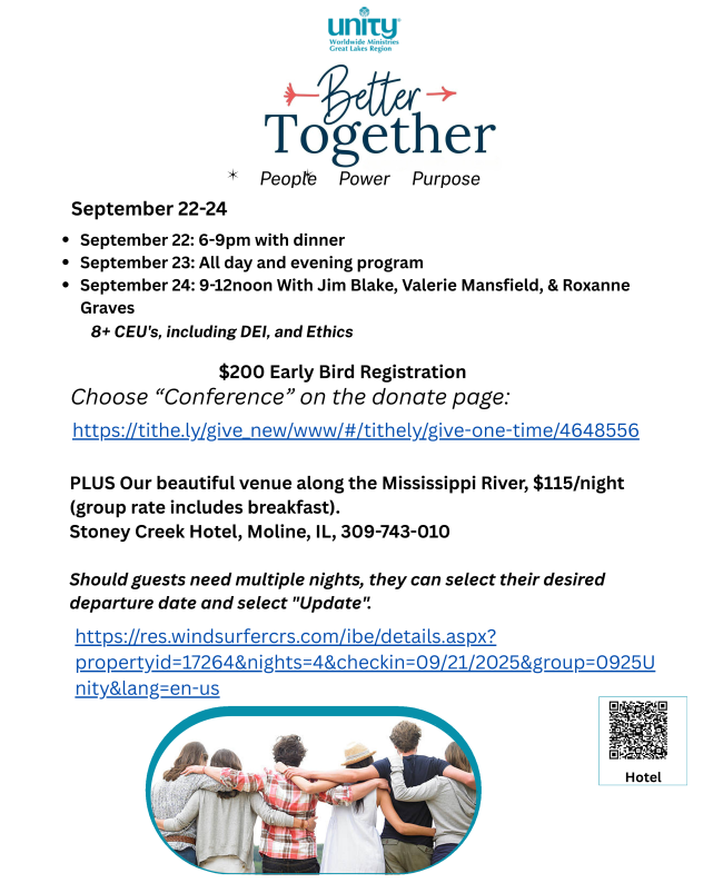 This event is open to all Youth Of Unity (Y.O.U.) entering 10th -12th grades in Fall 2025 (plus recent grads) & their adult leaders. Look for registration details here in early April.