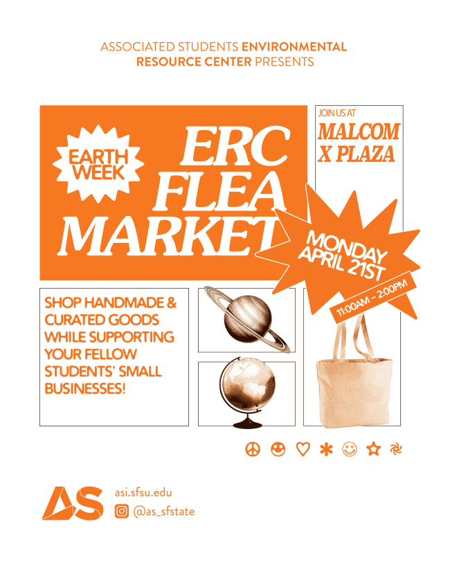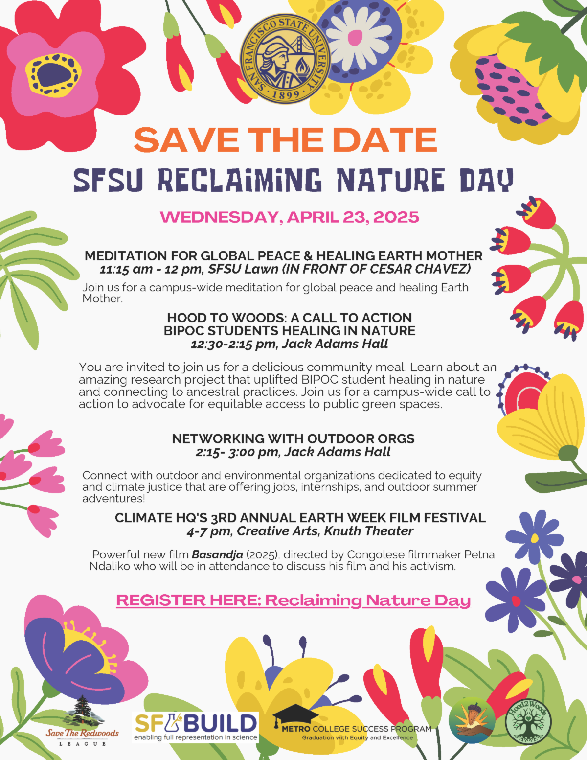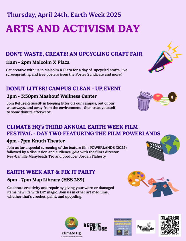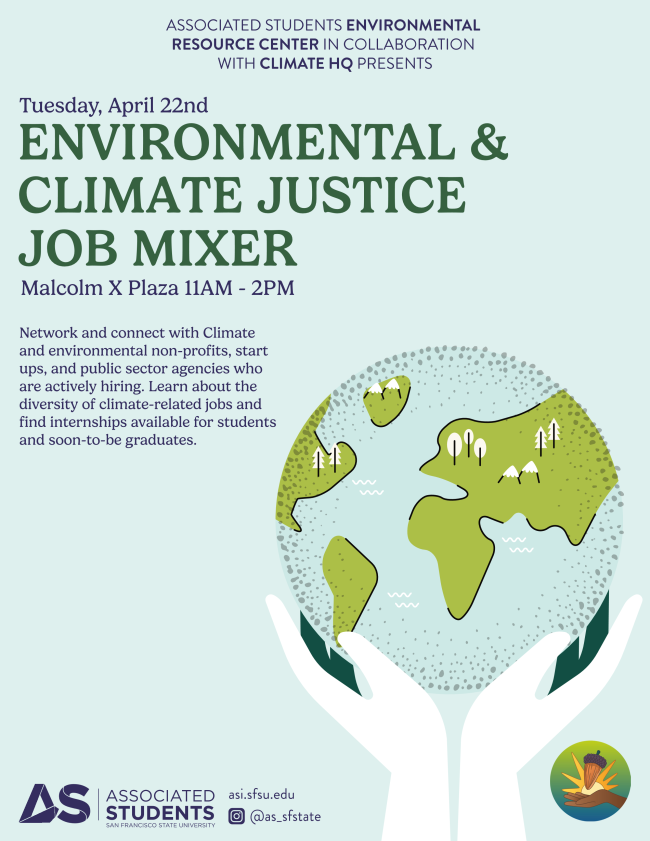 Join us all week April 21-24 at incredible events taking place on our campus to get you job-ready and inspired by films, arts, educational events, a fix-it party and flea market, and campus-wide meditation. This is the first year that Climate HQ registered all its events as part of SF Climate Week, meaning they will be public events where SF State students will meet potential employers and other like-minded activists, artists, professionals, and more. See below for each event and sponsors! Don't miss out!