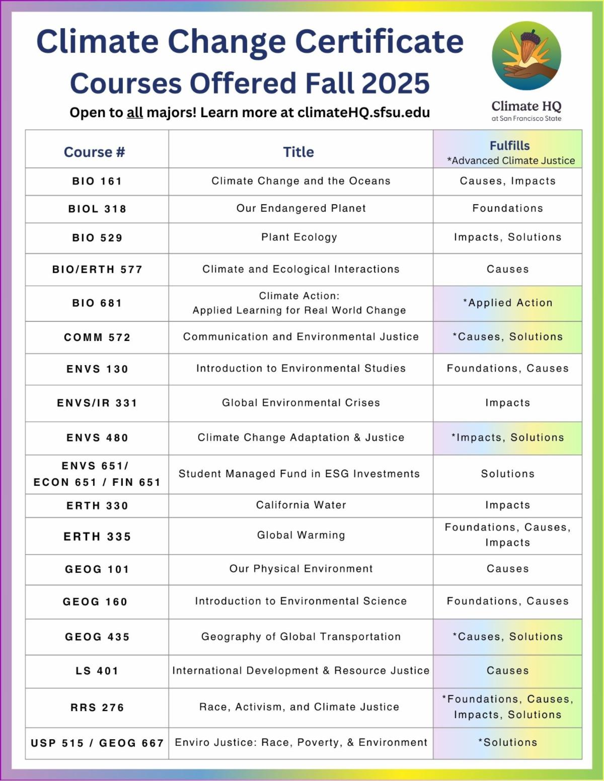 Interested in the Climate Change Certificate? Need advising? This unique 13-19 unit program is open to students of any major and is a great way to complete your SF State Studies requirements along with many of your Upper Division and even major requirements too! Students take 5 classes, one in each of the following areas: Foundations, Causes, Impacts, Solutions, and a Practicum course. Students gain an interdisciplinary overview of climate change issues and climate justice. This is a great way to get started in studies on climate change and is flexible to accommodate students in all majors.