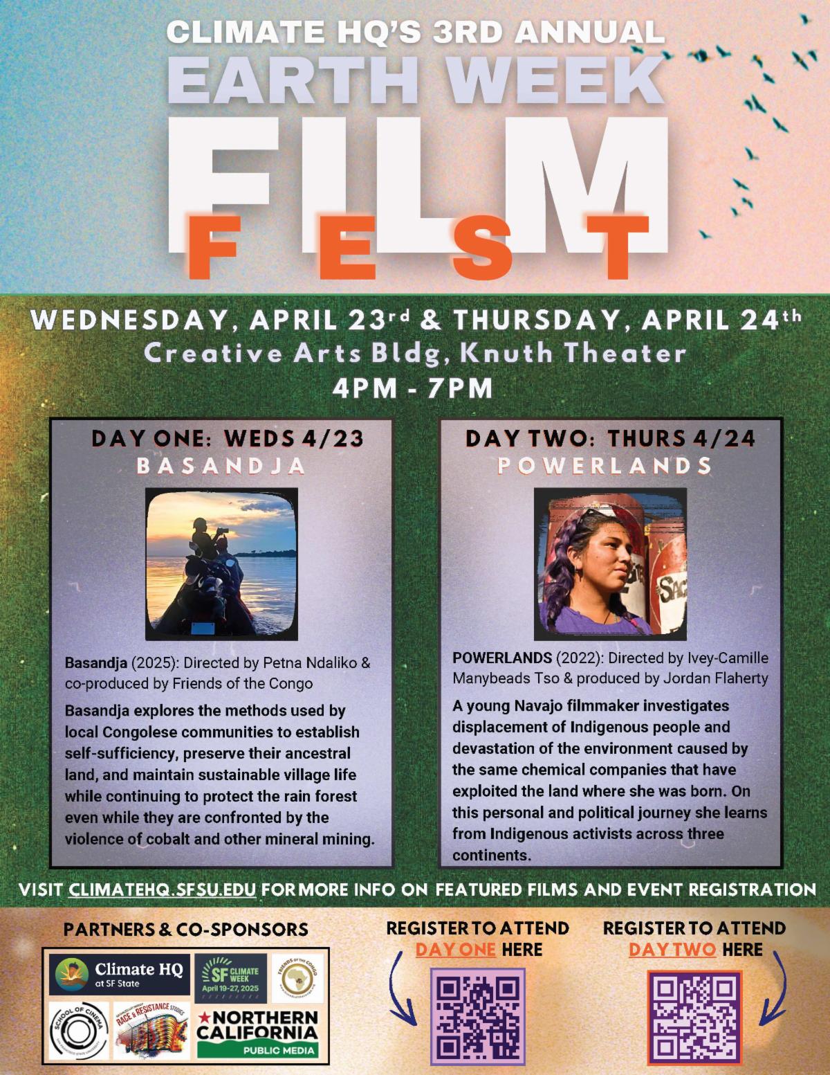 Our unique Film Festival is designed to provide SFSU students with meaningful opportunities to build deeper community connections through art and storytelling. Students have the opportunity to screen their creative climate, environment, and justice-related work alongside professionals in filmmaking, video production, and multimedia arts.