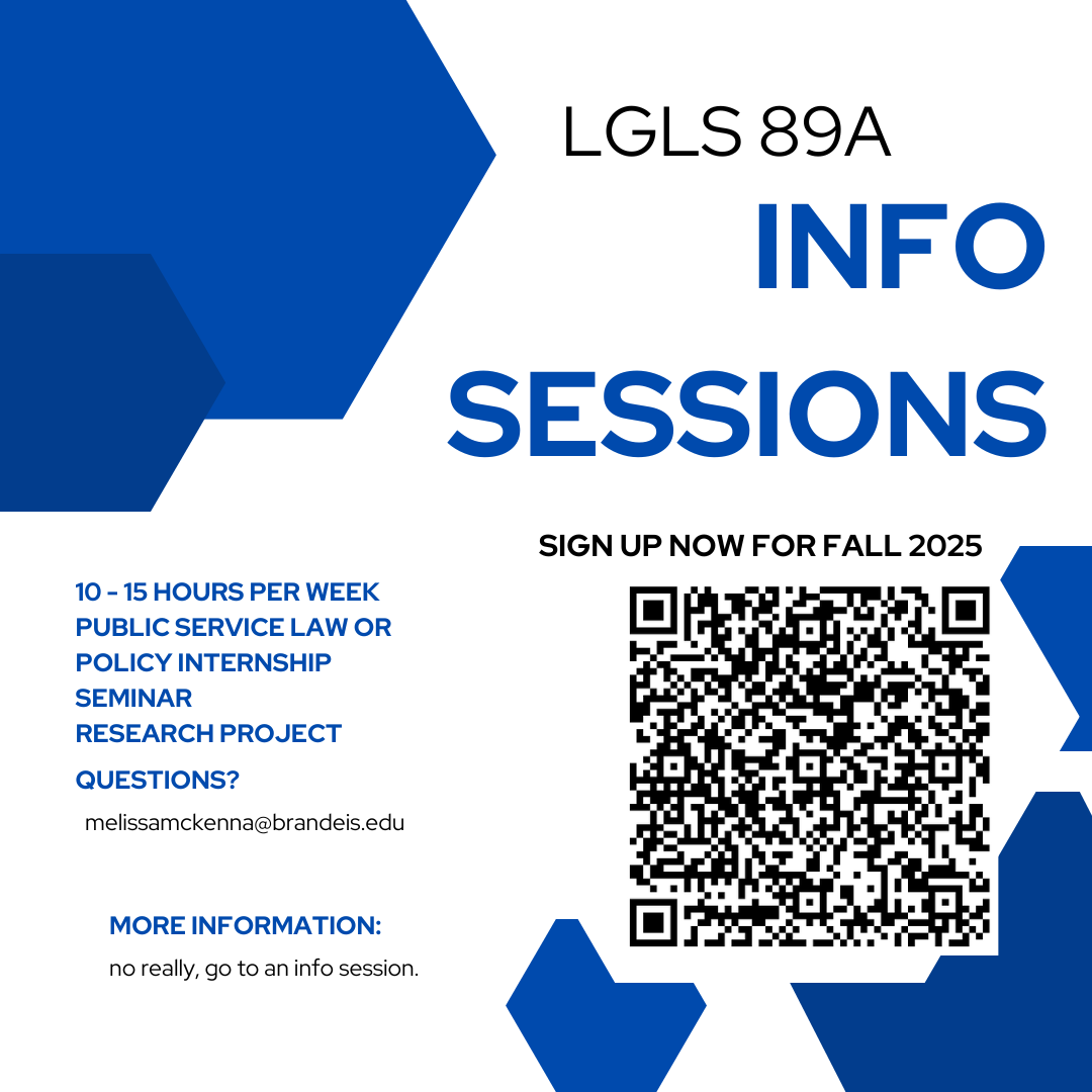Are you interested in taking LGLS 89A Law & Society Internship & Seminar next semester? An information session is required prior to course registration! Sign up here via the QR code. If the timing doesn’t seem like it’s going to work out, consider taking the summer session instead! Email melissamckenna@brandeis.edu for more information.