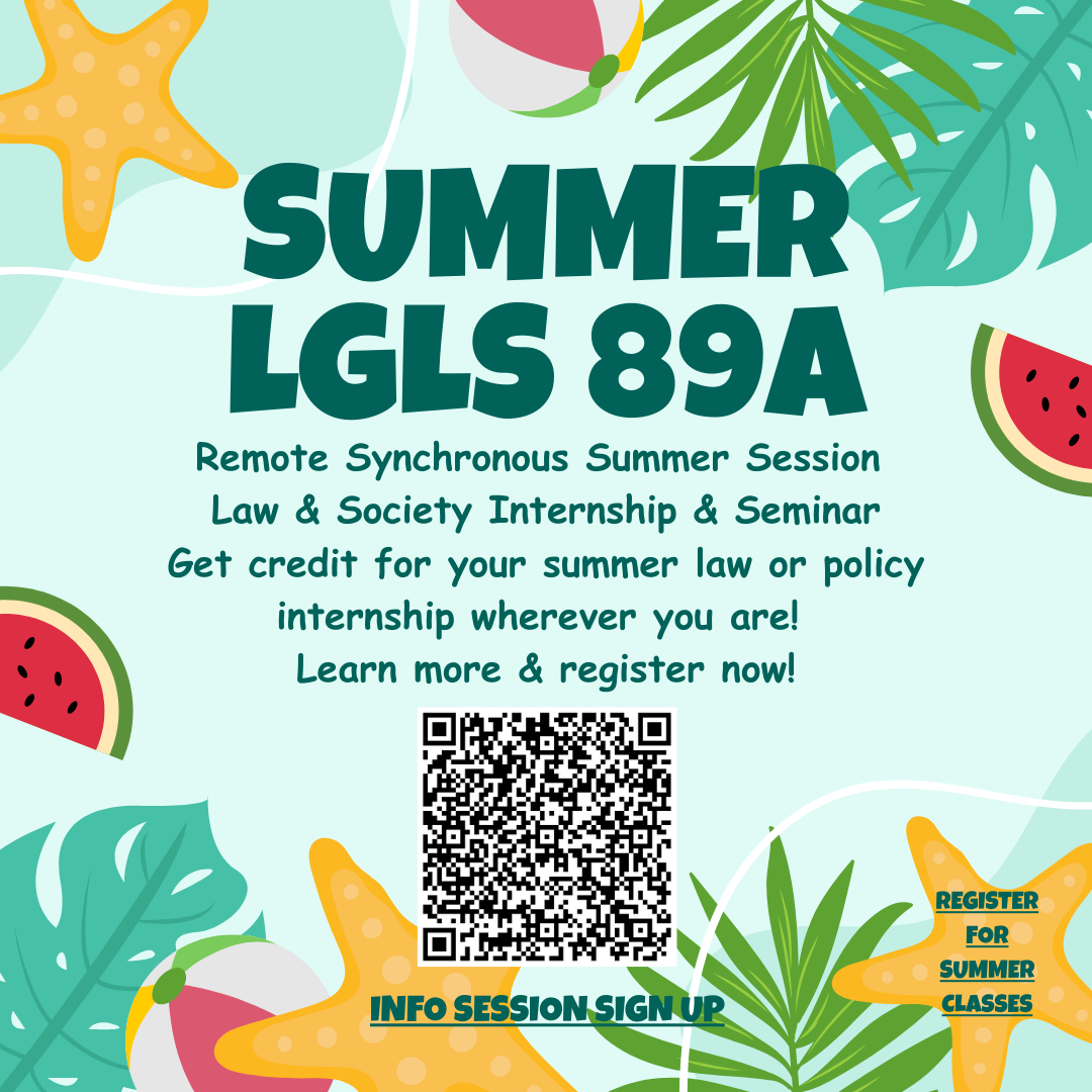 Do you have a summer law or policy internship at home? Consider taking the summer session of LGLS 89A! This course will be synchronous but virtual, allowing for internships all over the globe. We would love to work with you as you take on the summer!