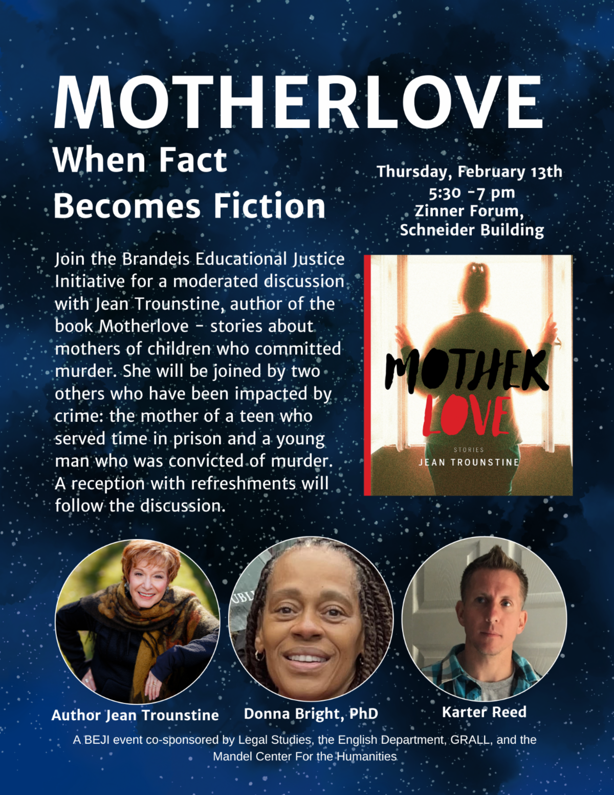 On February 13, students and faculty gathered to hear from author Jean Troustine as she spoke about her book Motherlove. She gave a reading from the book and then was joined by Karter Reed and Donna Bright to further discuss both having your child incarcerated and being incarcerated yourself. After a moderated discussion, they opened the floor to audience questions and were able to connect with the Brandeis comm