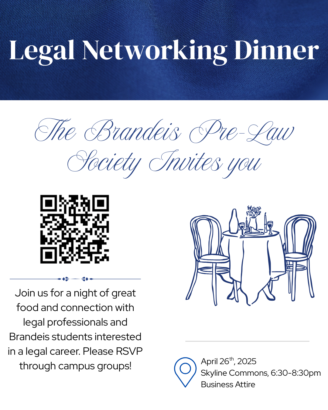 Are you a Legal Studies student looking to connect with the department? Join the Brandeis Pre-Law society for a legal networking dinner! This is a great opportunity for students to share a meal with legal professionals and build connections. We hope you join us in Skyline Commons on April 26th at 6:30 p.m.!