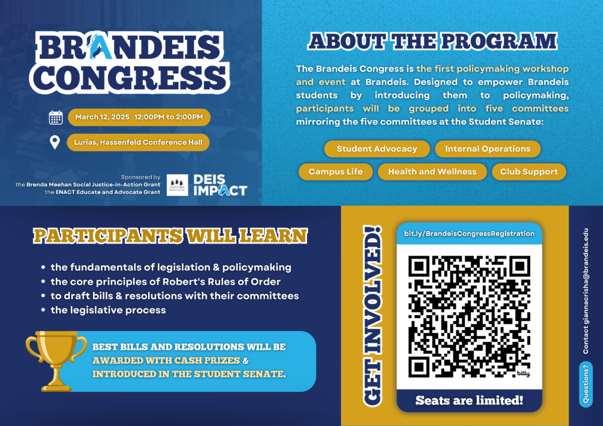 On March 12, students had the opportunity to participate in the Brandeis Congress event as a part of Deis Impact social justice festival! During this two hour session, participants were given an overview of legislation & policy making, Robert’s Rules of Order, the legislative process and how to draft bills and resolutions within their committees. At this policy making workshop, students were split into five committees: Student Advocacy, Internal Operations, Campus Life, Health and Wellness and Club Support. These committees each created bills and resolutions, hoping to win a cash prize and an introduction to the student senate.