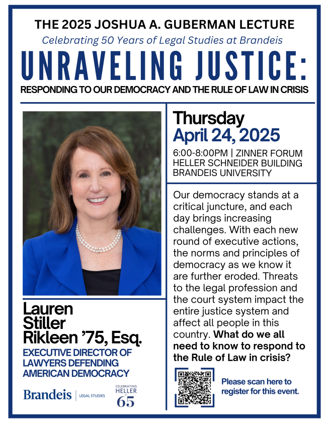 The Legal Studies Program invites you to join us for the 2025 Joshua A. Guberman Lecture! This lecture, which is a collaboration between the Heller School and Legal Studies, honors lawyers and law-adjacent professionals who have committed their careers to the pursuit of social justice. Through their lecture, they inspire and share their wisdom with students, faculty, and alumni. Join us on April 24th at 6:00 p.m. in the Helller Schneider Zinner Forum!