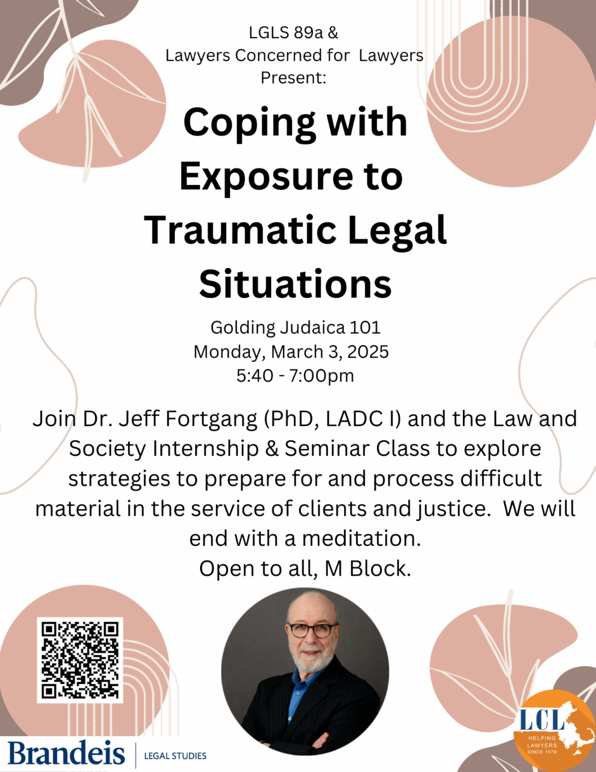 On March 3, the Law and Society Internship & Seminar Class partnered with Lawyers Concerned for Lawyers to present “Coping with Exposure to Traumatic Legal Situations.” Attendees joined Dr. Jeff Fortgang and explored strategies to prepare for and process material in the service of clients and justice. The event then concluded with a guided meditation for all.