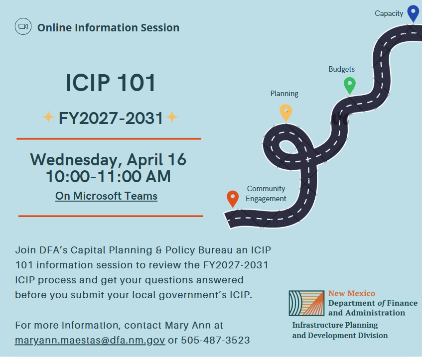 If you have any questions about the Local Government ICIP process, contact Mary Ann Maestas at DFA or reach out to Felicity Fonseca at NCNMEDD.