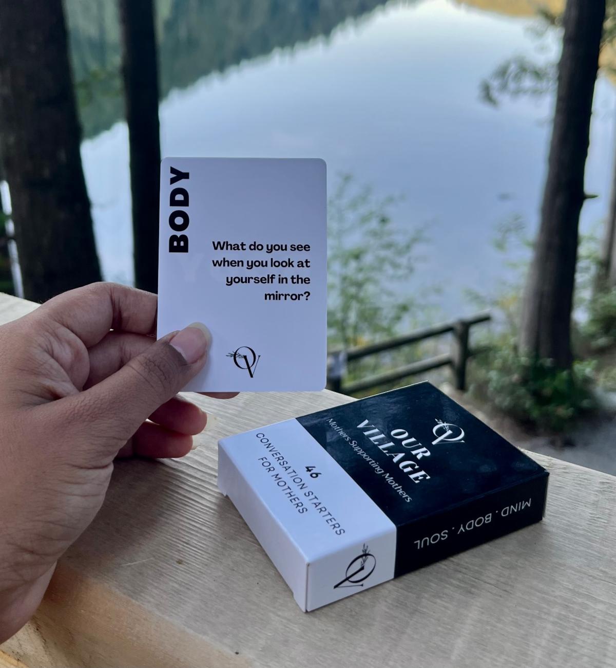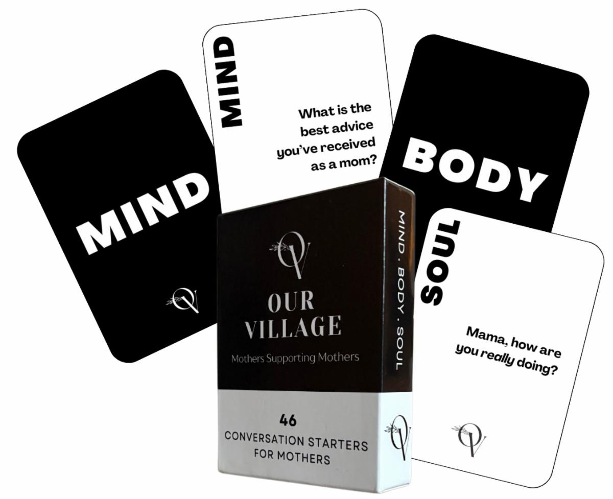 Our Village is a thoughtfully designed card deck for moms, featuring engaging conversation starters across three themes: Mind, Body, and Soul.