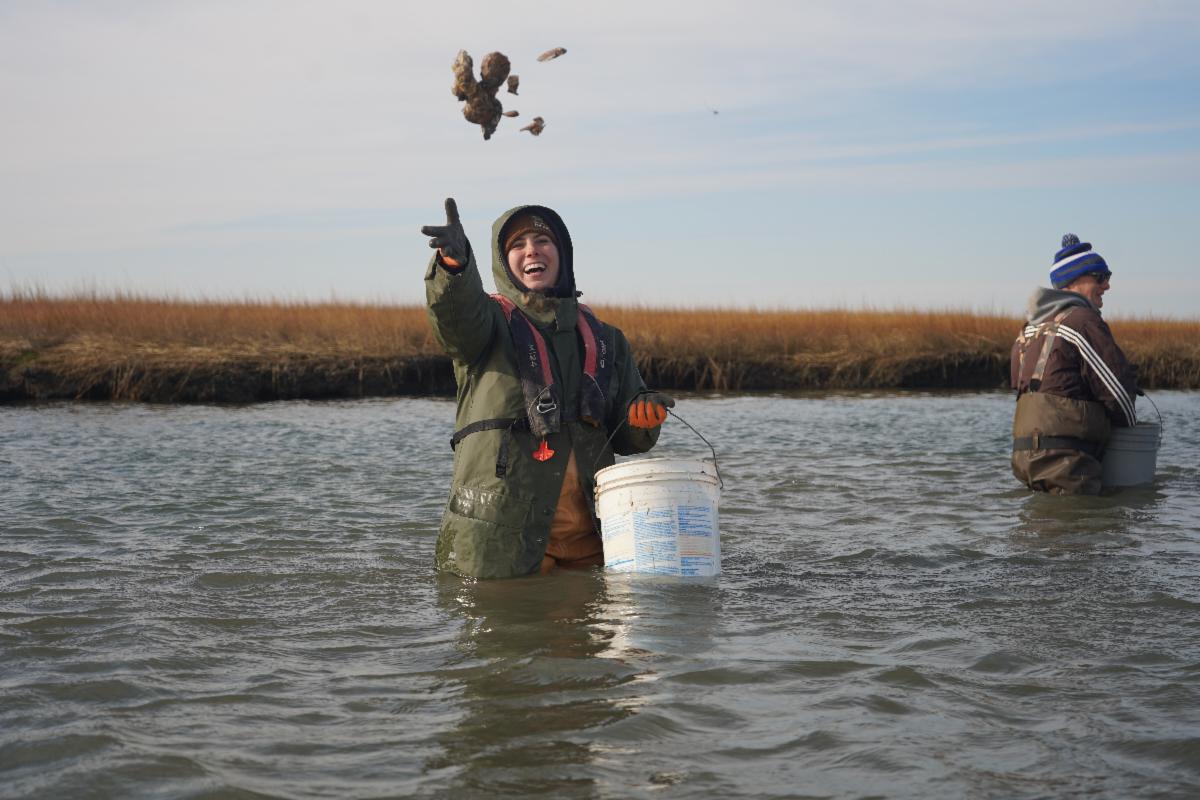 Taylor Hoffman from the Delaware Center for the Inland Bays stocks the Indian River Bay with oysters. (Photo Credit: Clare Magargal) | | |