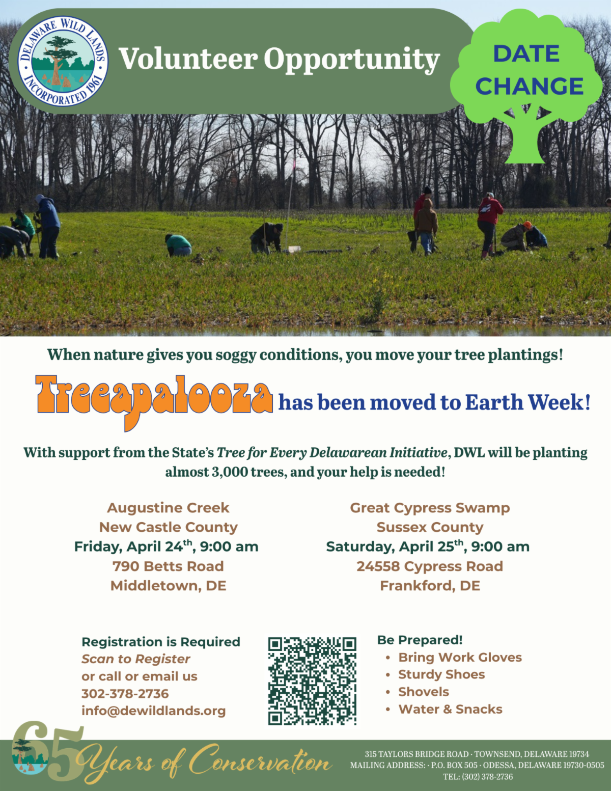 Join us this spring and start the year off right by planting trees! With support from the State’s Tree for Every Delawarean Initiative, DWL will be planting almost 3,000 trees at Augustine Creek in New Castle County (Friday April 24th) and the Great Cypress Swamp in Sussex County (Saturday April 25th). From the coastal marshes in the north to the majestic stands of baldcypress trees in the south, help us protect and strengthen Delaware’s natural heritage. Register now, and stay tuned to DWL’s social media for more details.