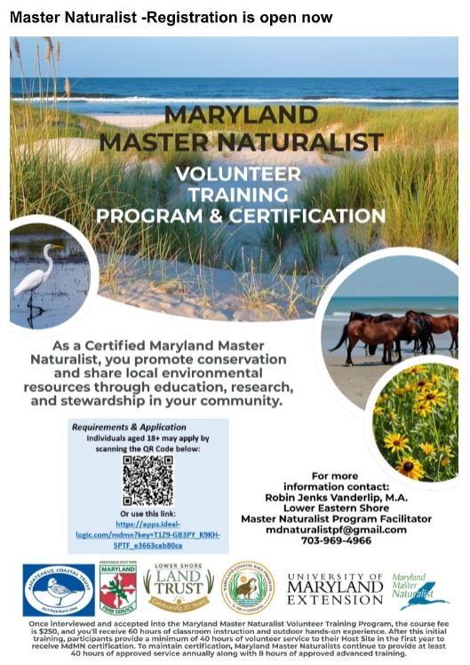 Have you ever had an interest in learning about nature and our natural world? Maryland Master Naturalist (MdMN) participants will obtain the skills of a naturalist, learn the importance of the environment and being better stewards of our planet, and learn how they can share information with the public. With so many topics of nature to learn about, this program will target the Lower Eastern Shore area of Maryland.