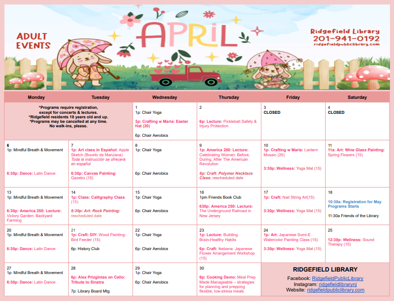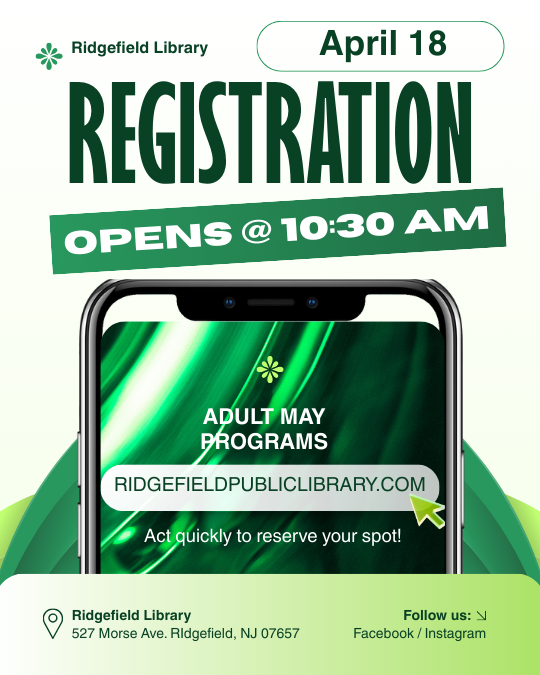 We are excited to share with you another full and exciting line up of FREE activities and programs at the Library! These events are especially prepared and designed for Ridgefield residents ages 18 and older to enjoy.