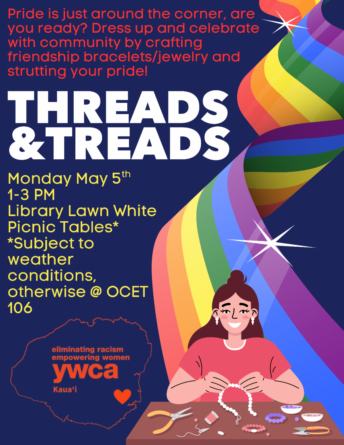 Pride is just around the corner, are you ready? Dress up and celebrate with community by crafting friendship bracelets/jewelry and strutting your pride! Open to all KCC staff & students! This event will be hosted at the LRC / Library Lawn Picnic Tables, subject to good weather, otherwise moved to OCET 106.