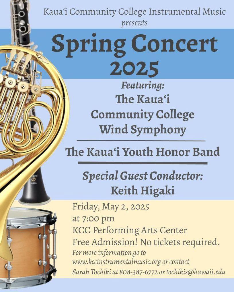 Enjoy the Kaua'i Community College spring wind symphony concert free! No tickets are required. See the flyer for more info.