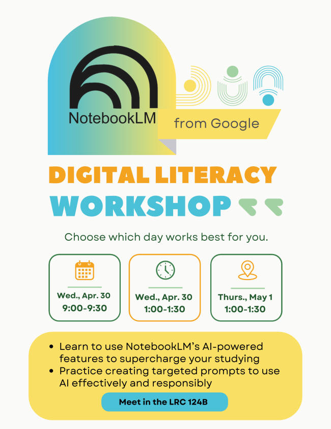 Preparing for finals? Discover how NotebookLM, Google’s new AI-powered tool, can help you study more efficiently. The Library is offering a digital literacy workshop that will cover the basics of NotebookLM and will include practical ways to use it for organizing and reviewing course materials.