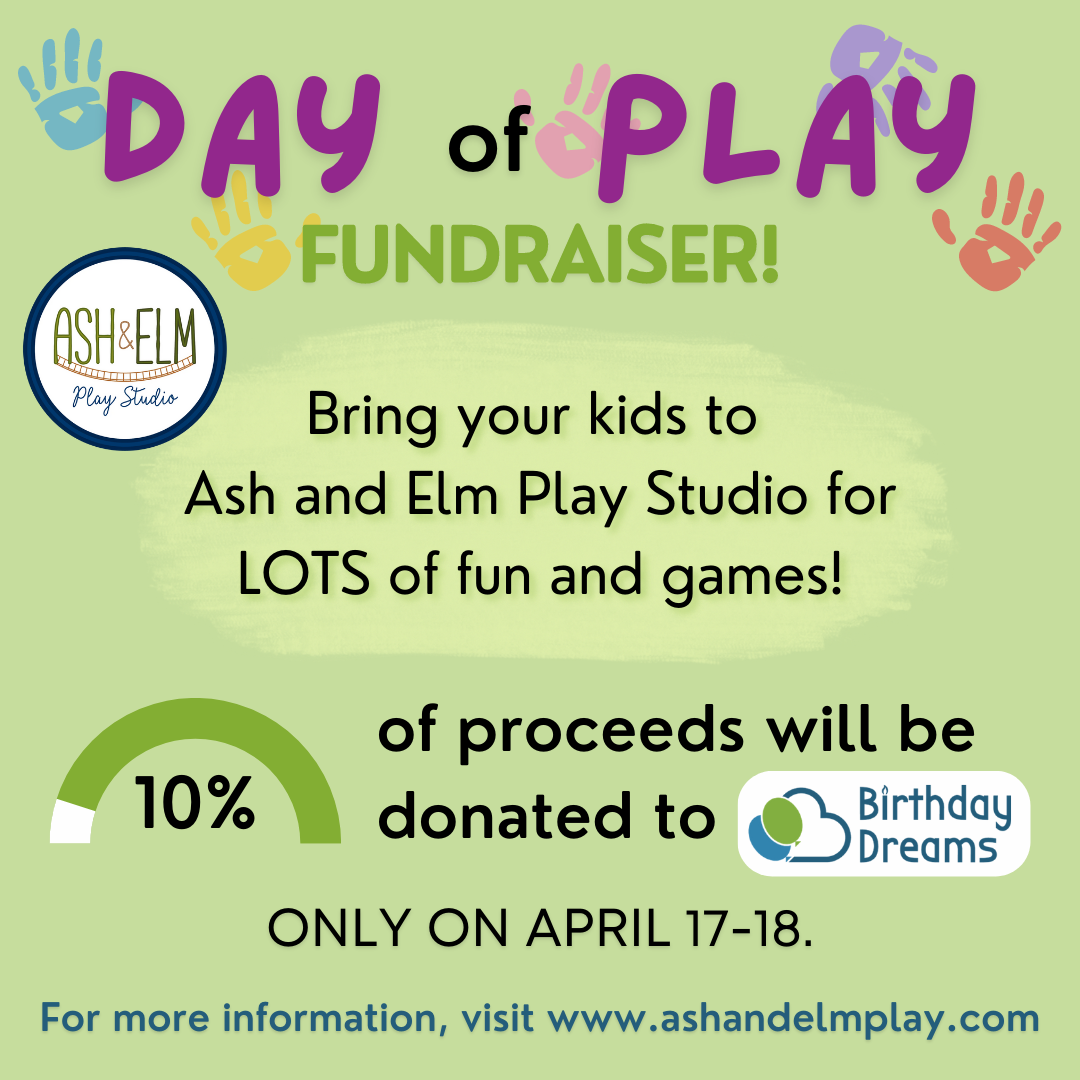 We are excited announce new partner, Ash & Elm Play Studio, is hosting “point-of-sale” fundraiser where 10% of proceeds on April 17 and 18 will benefit Birthday Dreams!