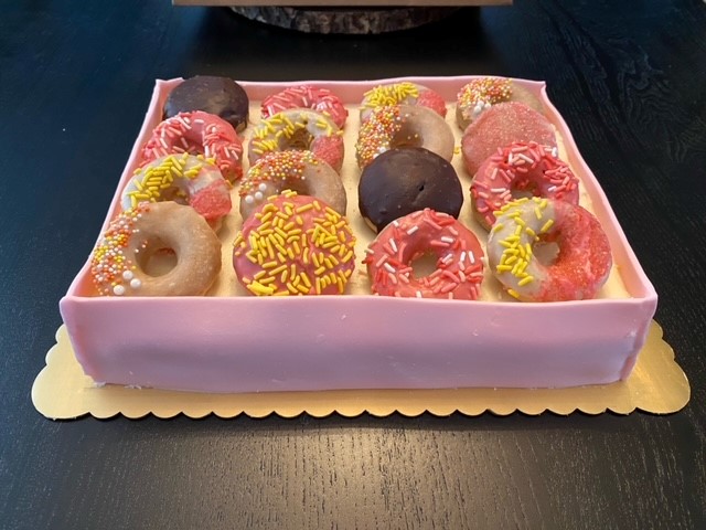 A very active two-year-old girl, who loves doughnuts, was surprised with this amazing box of doughnuts cake created by Britt Oswald. The birthday girl also received a bouncy toy, books, and gift cards. Thank you, Jim Waugh, for making the delivery.