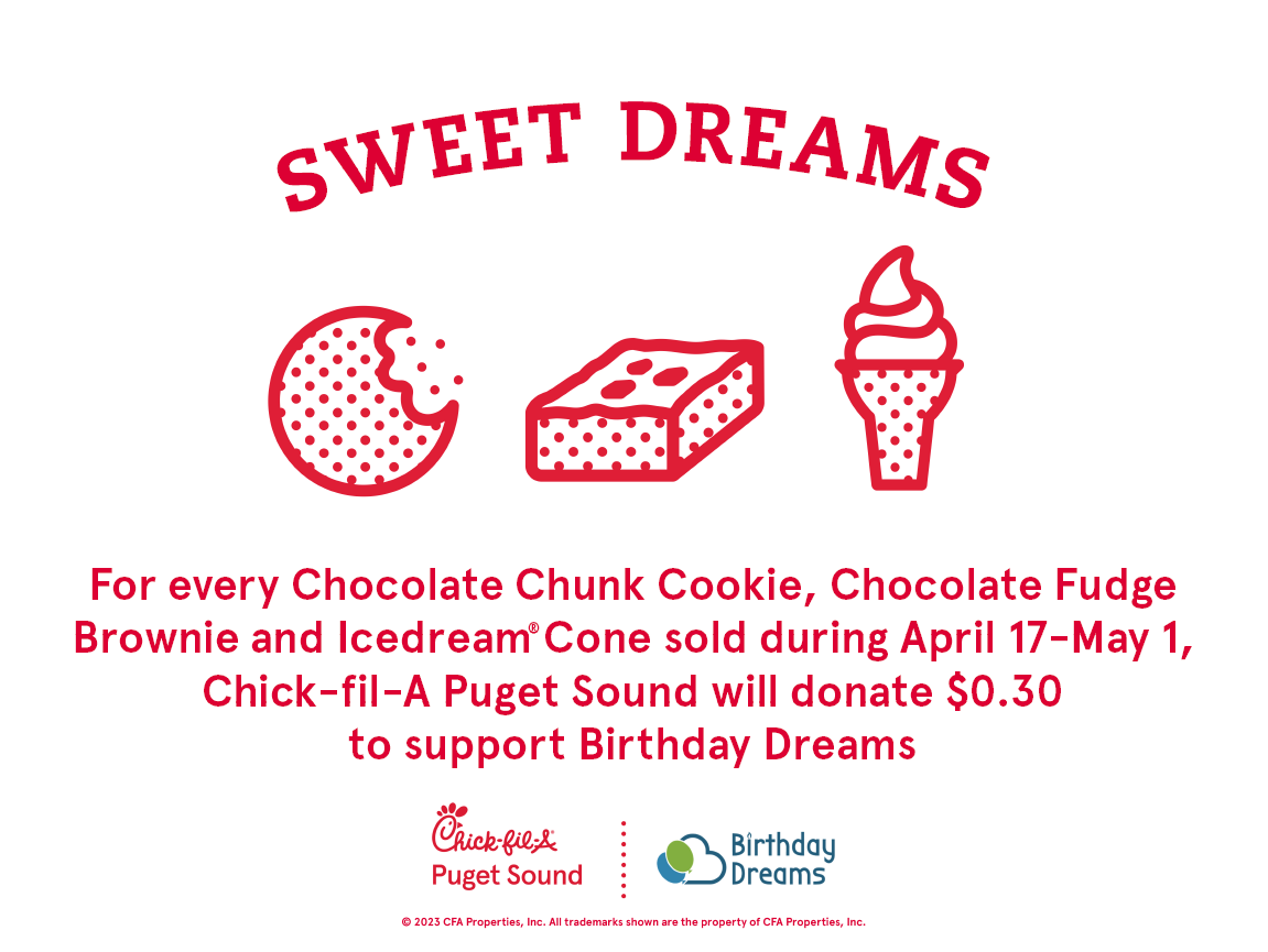 For every chocolate chunk cookie, chocolate fudge brownie, and Icedream® Cone sold April 17 - May 1, Chick-fil-A will donate $0.30 to Birthday Dreams!