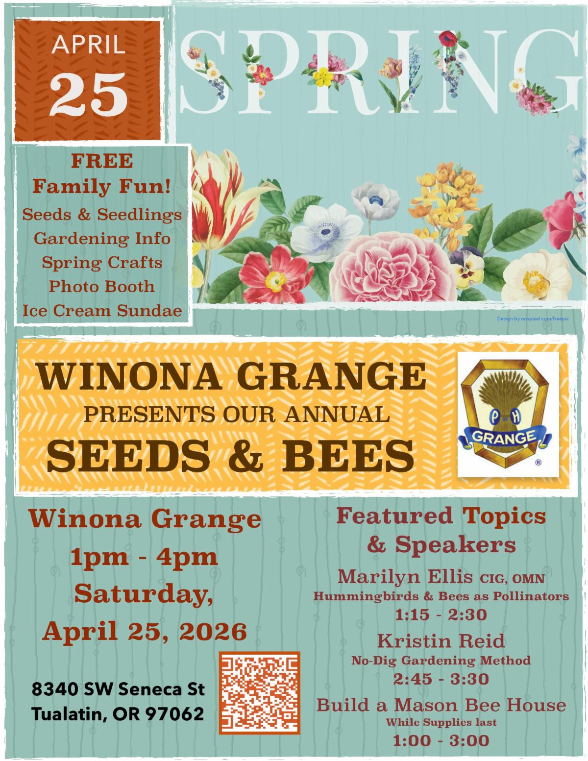 Free seeds and takeaways to welcome pollinators will highlight an afternoon of family fun and learning on Saturday, April 25, at Winona Grange in Tualatin, from 1-4 pm.