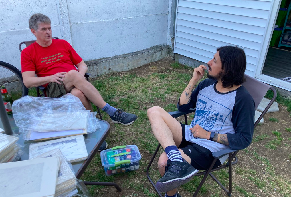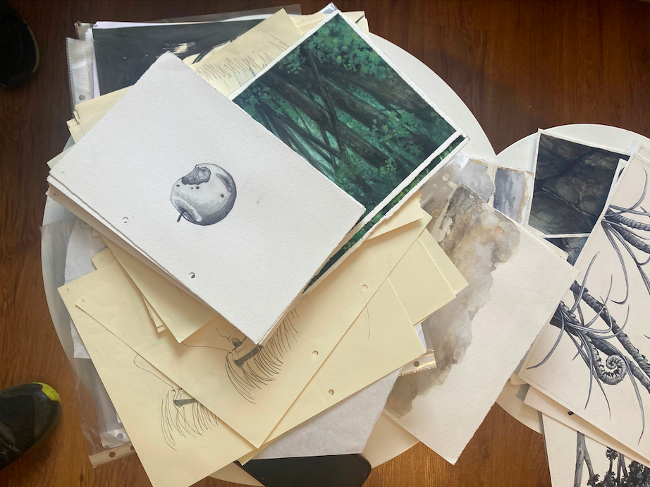Draftsman and artist Estéban Pérez spends most of his time by himself, working in his home studio in Puerto Varas, Chile. We’ve been visiting him since 2022, and witnessed the exponential increase in drawings that threaten to leave the studio and invade the entire house. Despite appearances, however, everything is under control when the creative process is ongoing, although stacks of hundreds of watercolors and drawings encroach from all sides of the small room as he labors to finalize a scene.