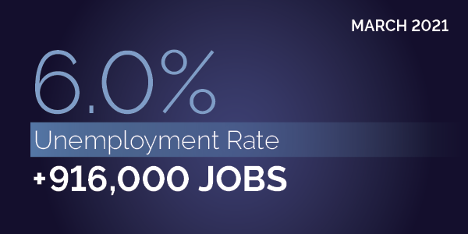 The U.S. economy gained 916,000 jobs in March, and the unemployment rate fell to 6% from 6.2% in February. Widespread job growth was led by gains in construction, leisure and hospitality, and public and private education.