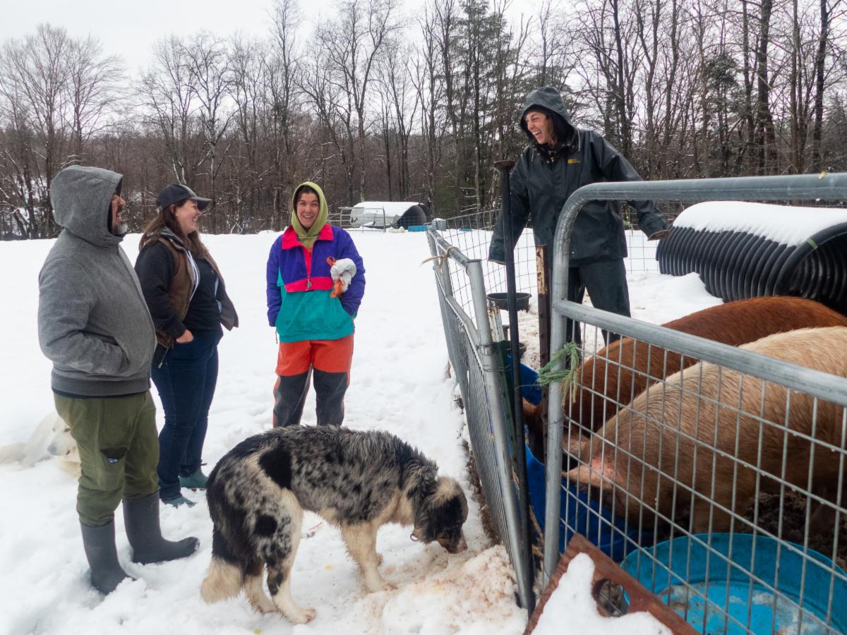 | | Pictured: Em and Rose of Union Brook Farm in Northfield, VT, give Antonio and Meg a tour of their pasture-raised pork and poultry operation. Photo courtesy NFFC. | | |