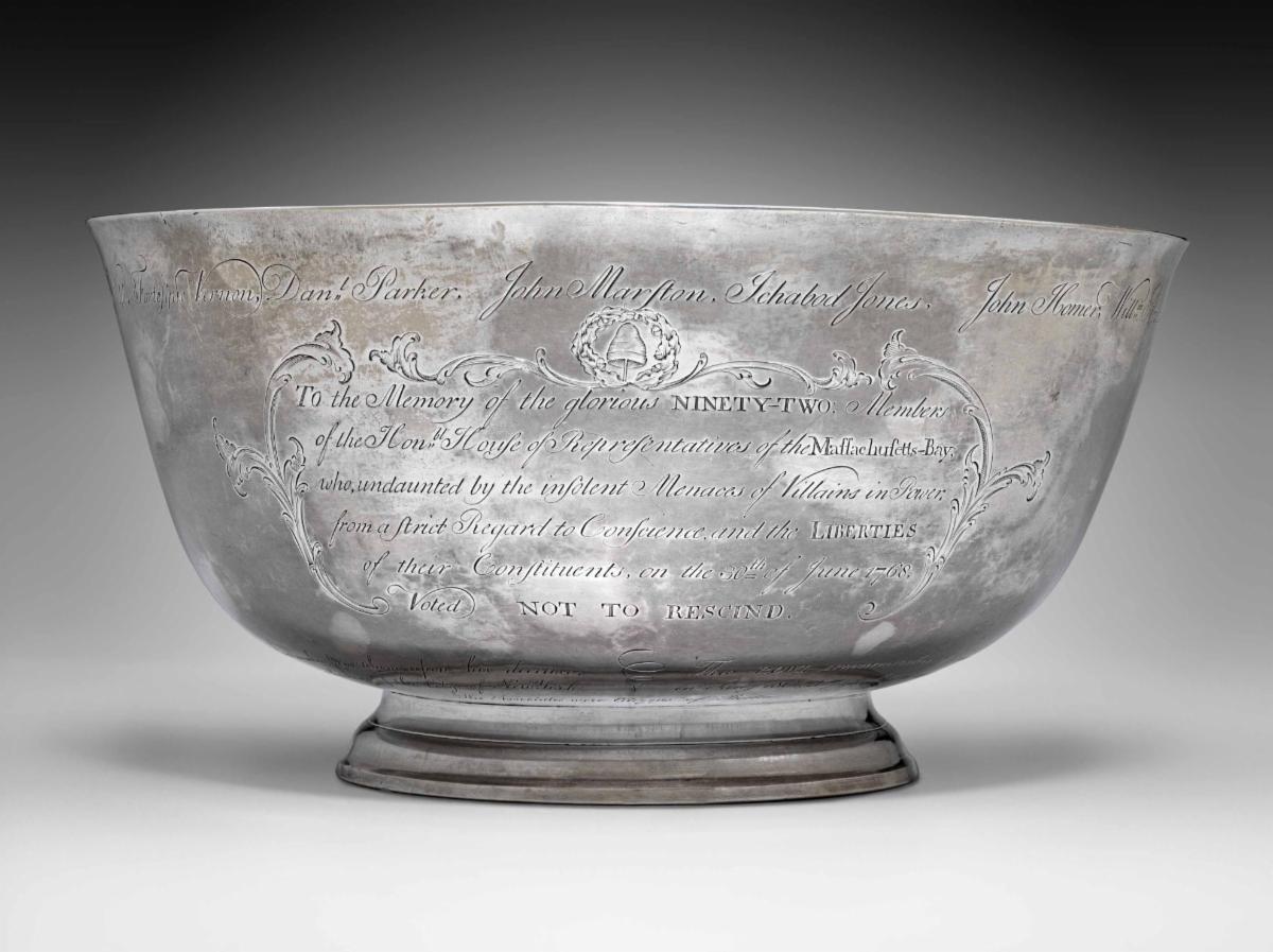 Crafted in 1768 by the silversmith and midnight rider Paul Revere, the bowl celebrates the defiant Sons of Liberty, Bostonians who vocally opposed British rule, and chastises the British authorities—or, as Revere’s wonderful engraved inscription puts it, the “insolent Menaces of Villains in Power”—who levied taxes on the colonies without their consent. The bowl embodies Bostonians’ raw and unbridled spirit of resistance and the convictions that led to the war for independence.