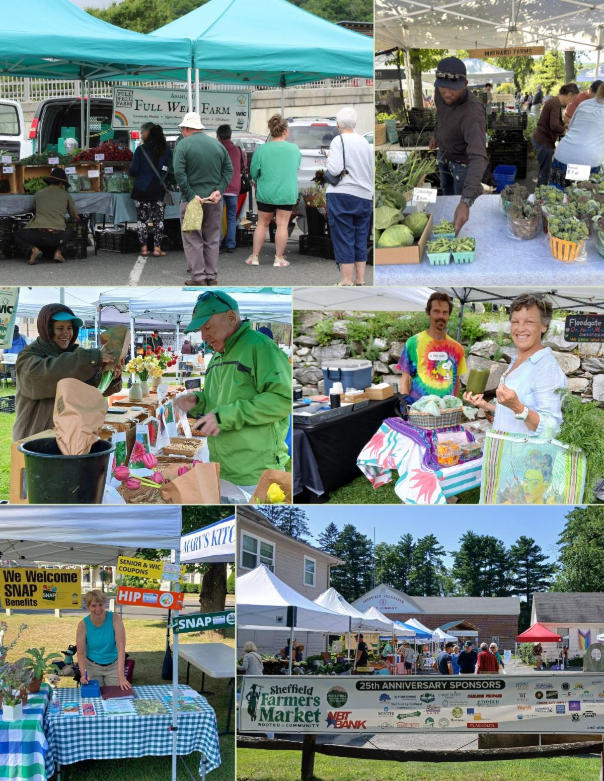 | | Photos, clockwise from top left: Full Well Farm at North Adams Farmers Market; Great Barrington Farmers Market; Floodgate Farm at West Stockbridge Farmers Market; Sheffield Farmers Market; Kathy DeVarennes at Lee Farmers Market; Meg Bantle at Pittsfield Farmers Market. | | |