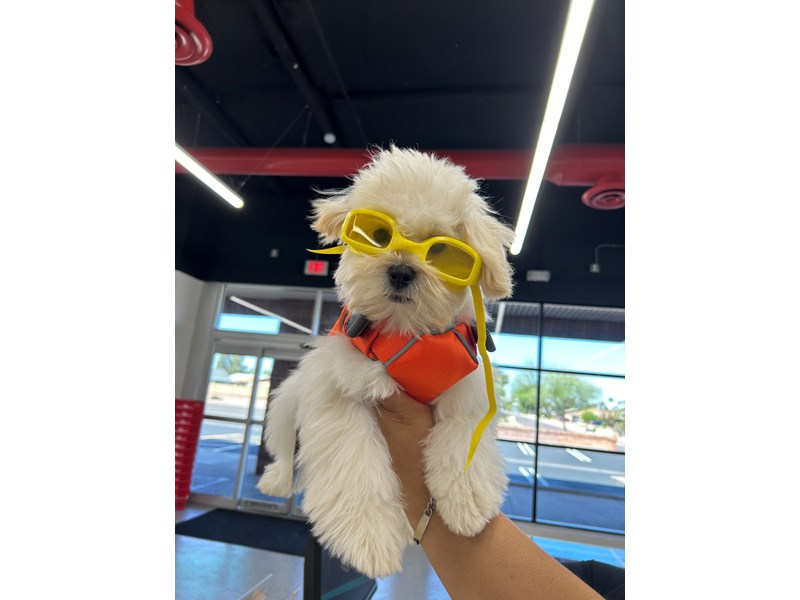 This Malshi is an utter charmer!! He would make the ideal family dog because he is fantastic with children, very cuddly, smart, and patient when being handled. He knows sit, down, walks well on a leash, and even roll over! (Okay, we admit, he is still working on roll over, but he’s coming along!) He has a cheerful personality and loves small animals and big dogs alike. He is truly the whole package!