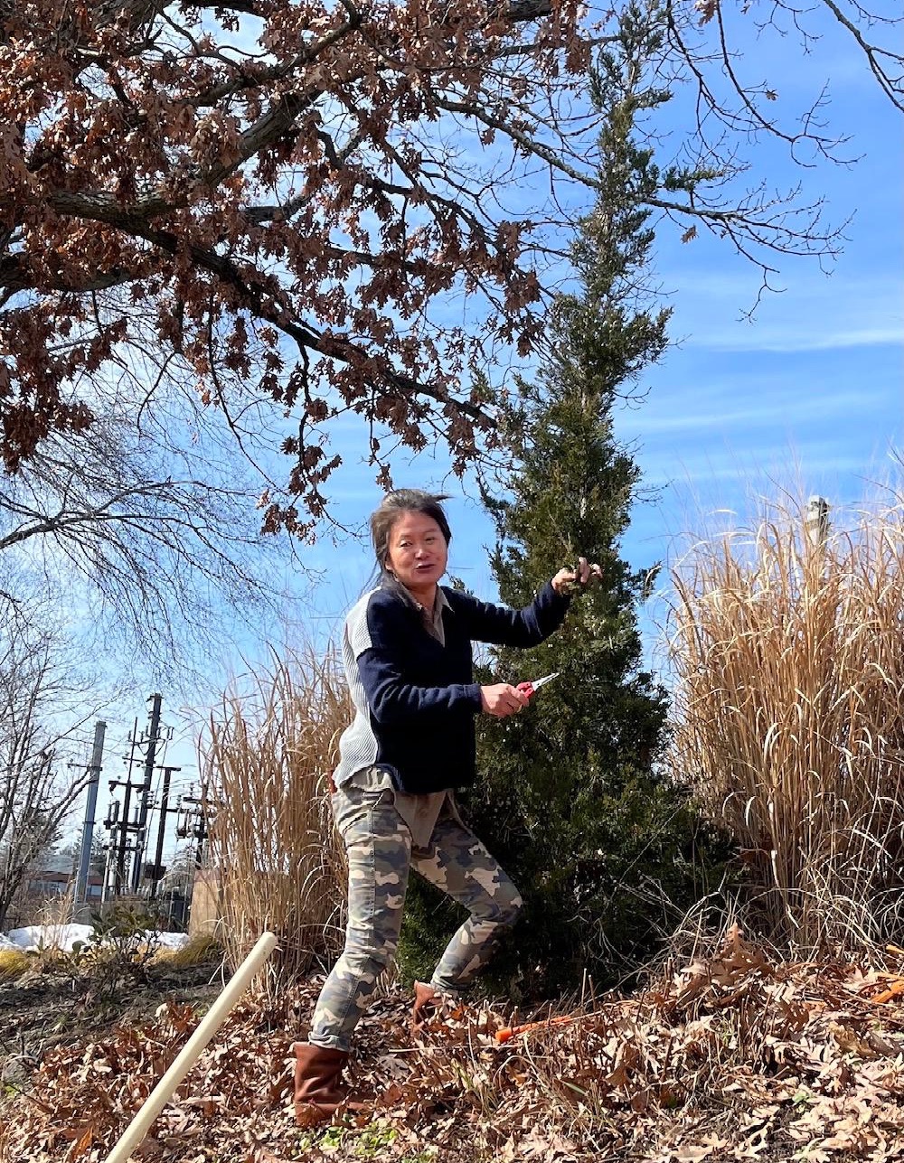 Ty Tan, original designer of the mail boxes garden, trims grasses.