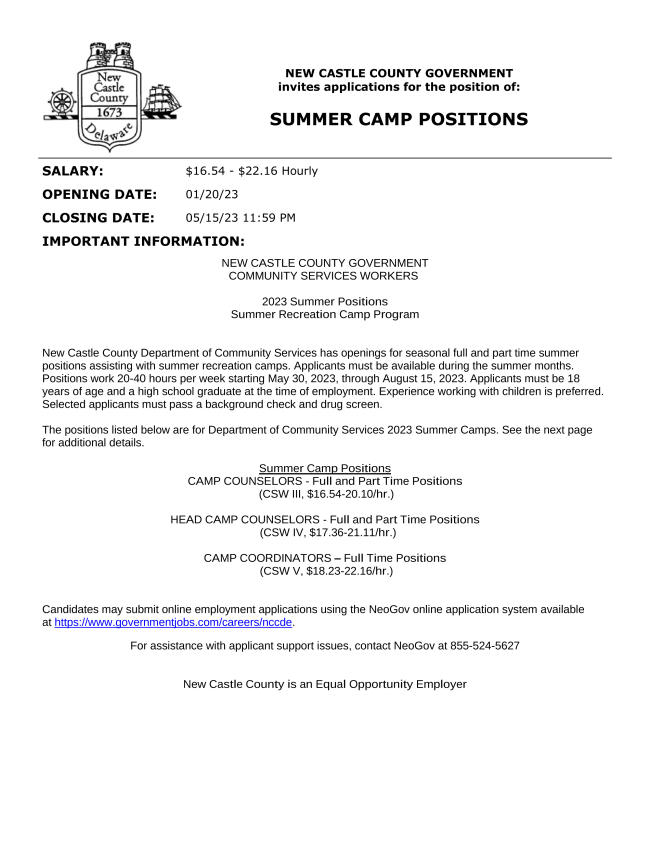 NCC Summer Camp Positions ($16.54 - $22.16 Hourly)