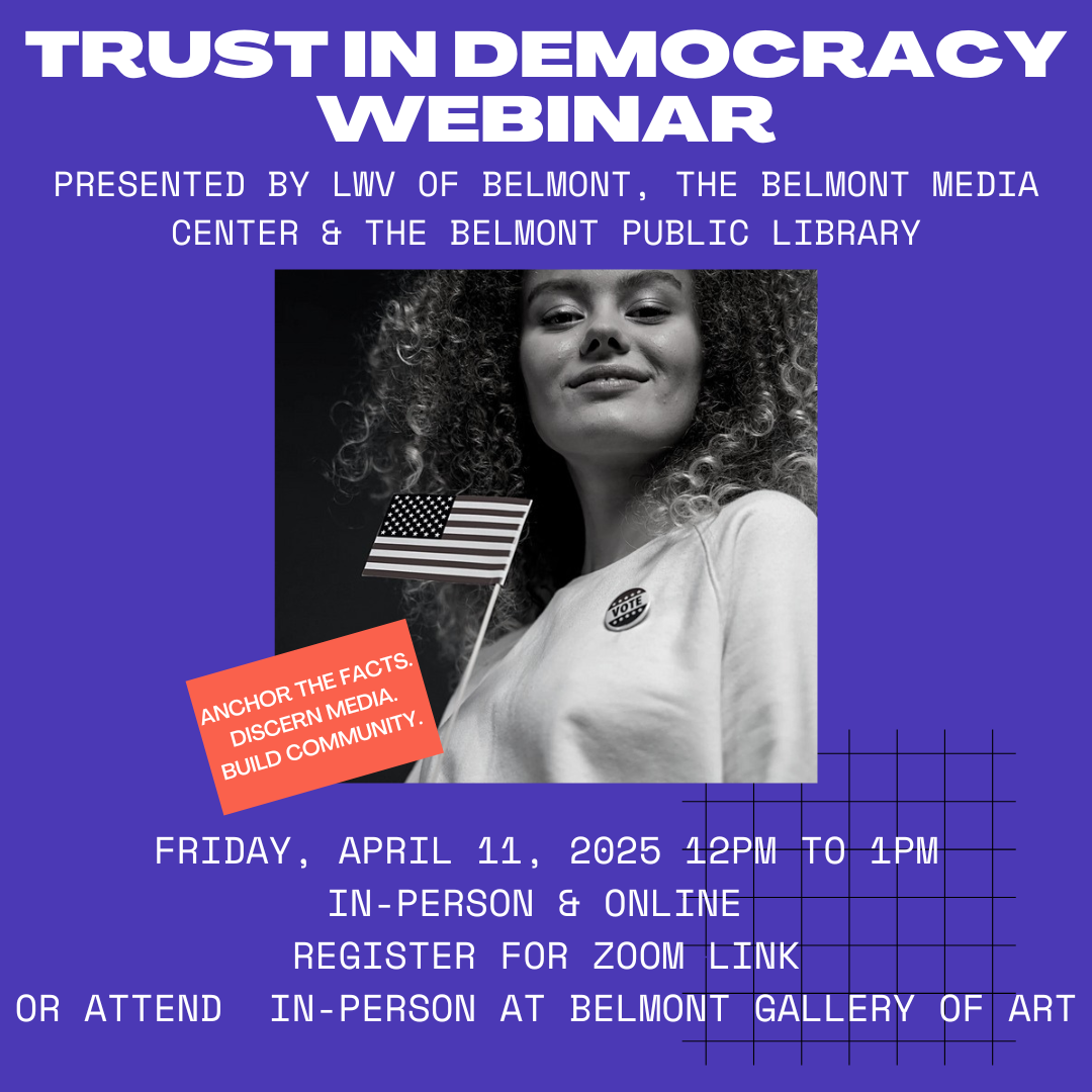 Please join the League of Women Voters of Belmont, the Belmont Media Center and the Belmont Public Library in welcoming Chelsey Cartwright from the League of Women Voters US as she educates us on how to be more educated consumers of the news and combat mis-, dis- and mal-information.