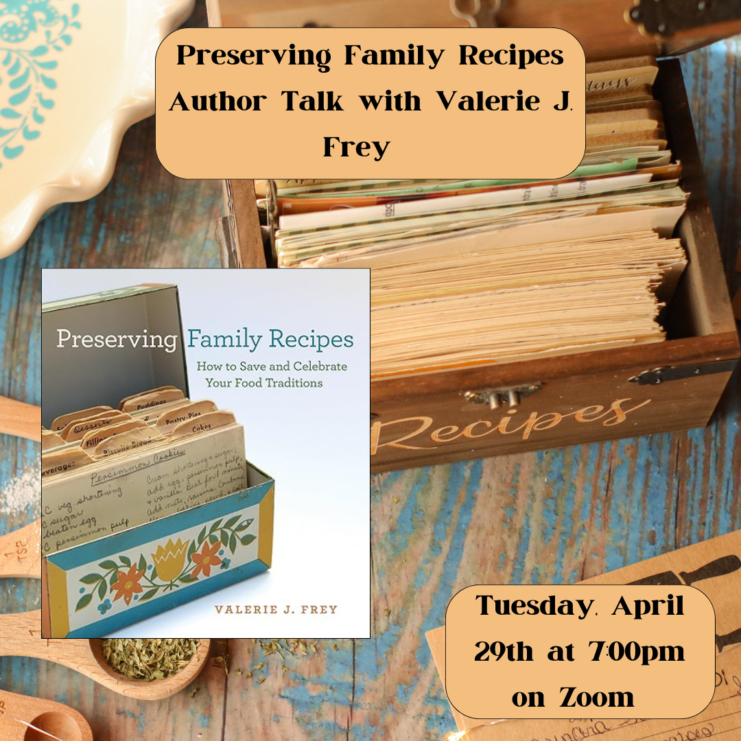 Join us for a virtual author talk with Valerie J. Frey, author of Preserving Family Recipes: How to Save and Celebrate Your Food Traditions, who will guide us through gathering, adjusting, supplementing, and safely preserving family recipes.