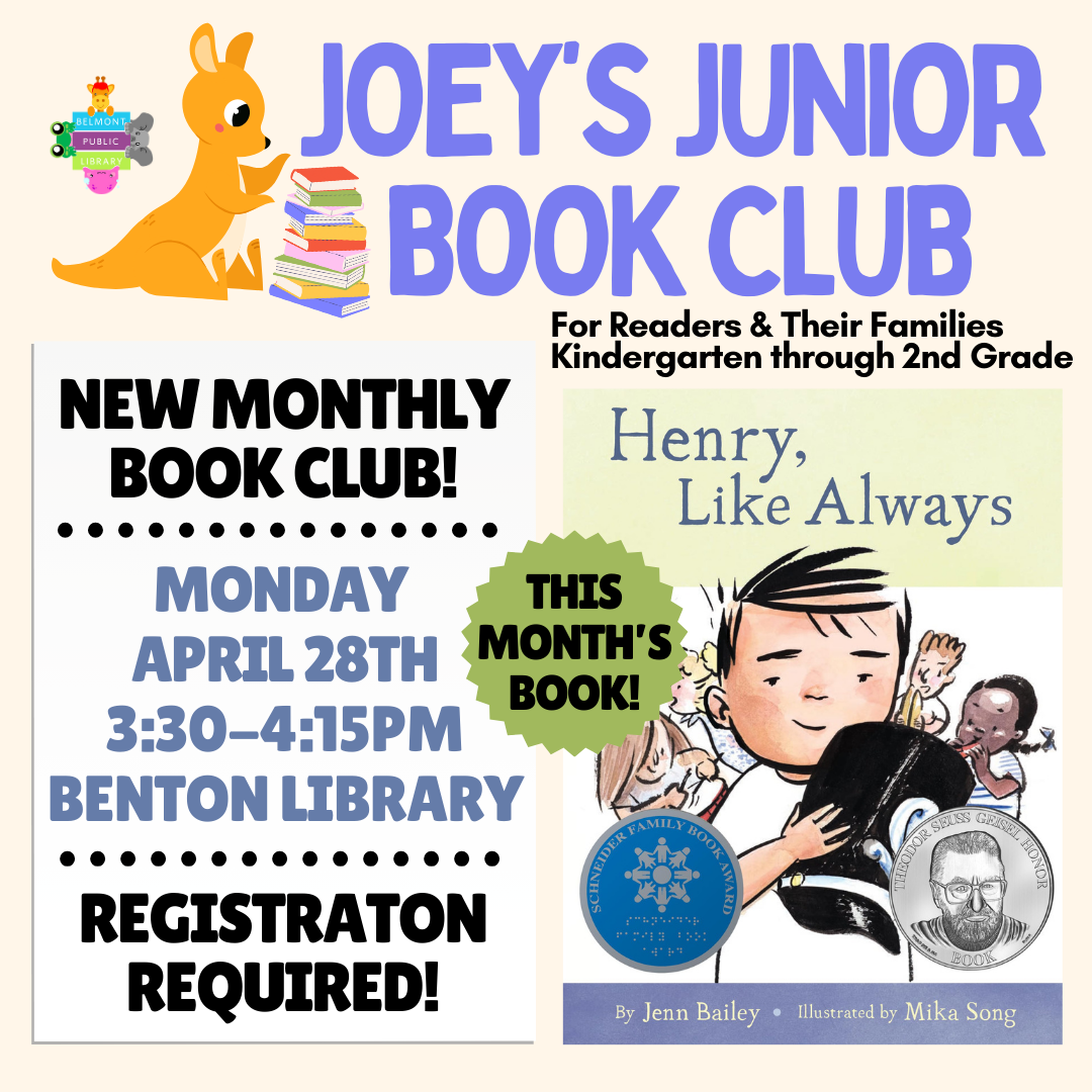 Join our monthly book club just for new readers and their grownups! Read the book at home, and then gather at the library to discuss the story and do fun activities. This month we'll be reading Henry, Like Always by Jenn Bailey.