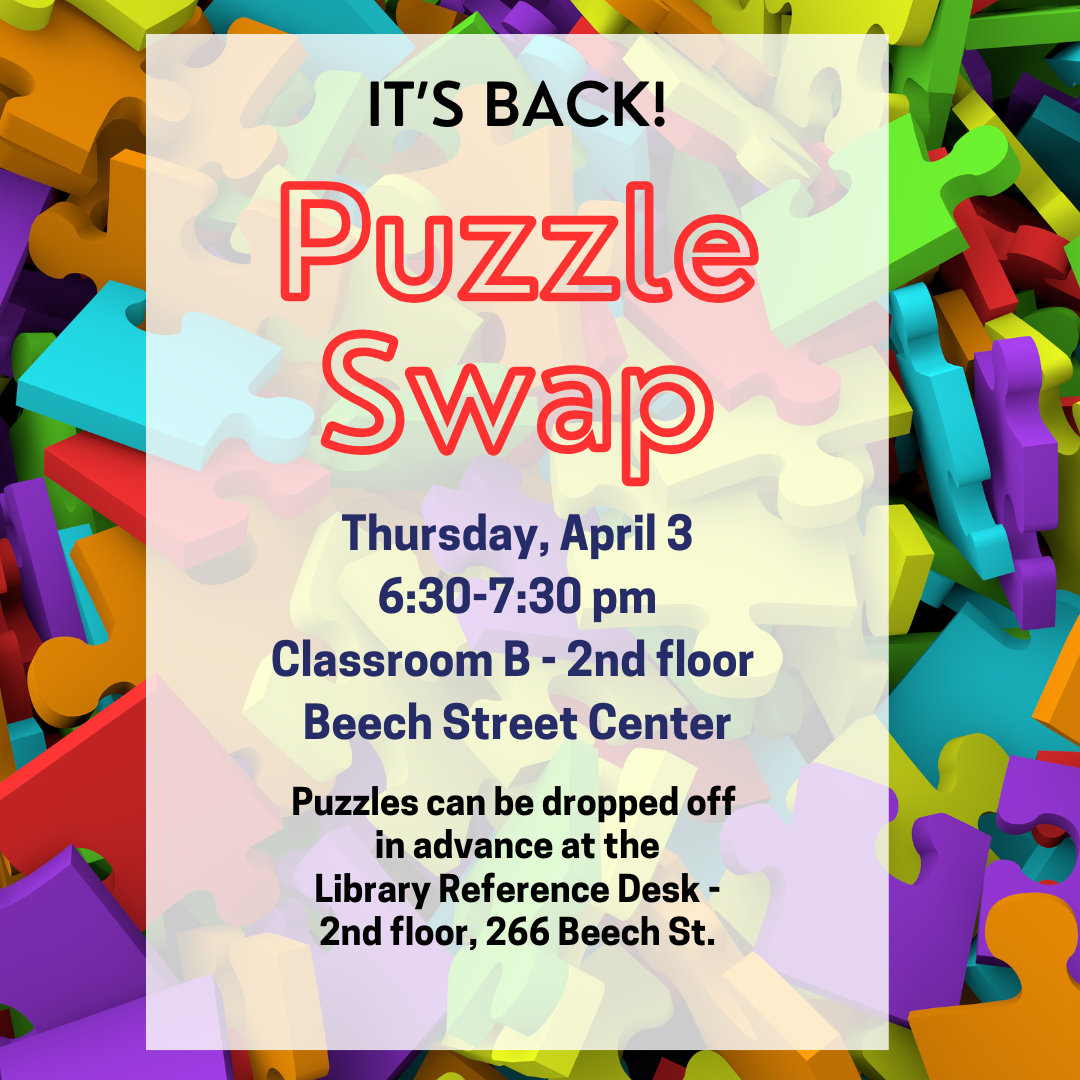 Puzzles may be dropped off in advance at the Reference Desk at Beech Street!