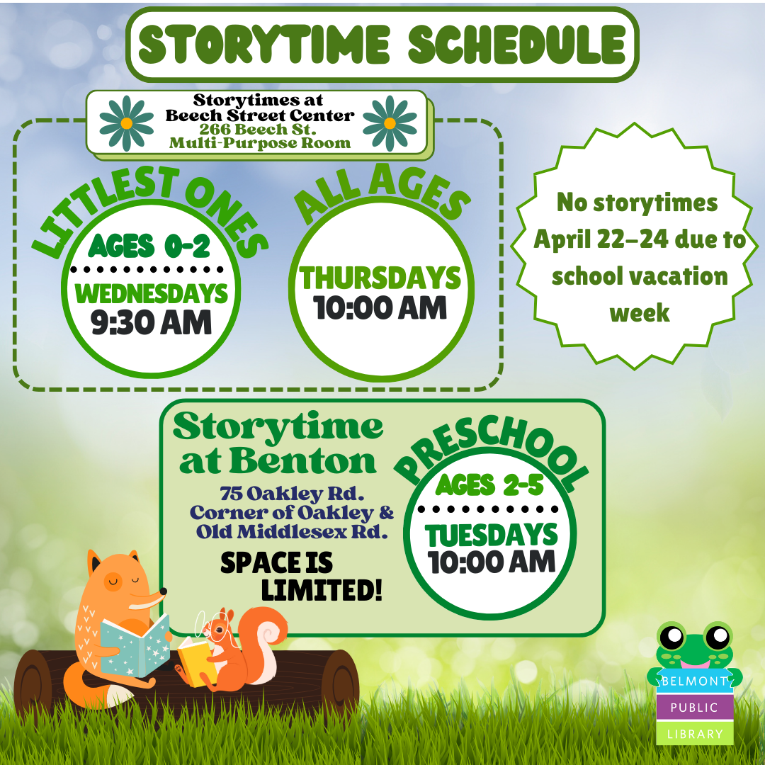 No story times April 22-24 due to school vacation week.