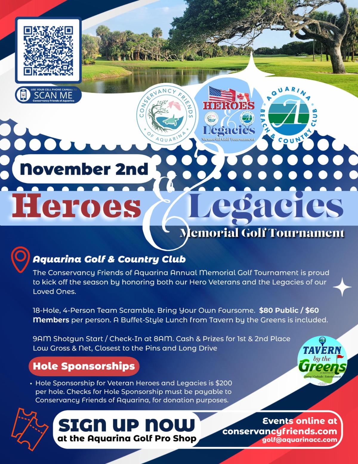 Register today for the Saturday, November 2nd, Conservancy Friends of Aquarina Heroes & Legacies Golf Tournament: