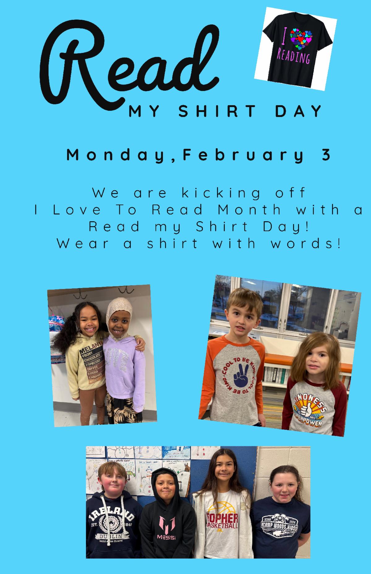 The first activity to kick off the month is a "Read My Shirt Day" on Monday, February 3. Wear something with words!
