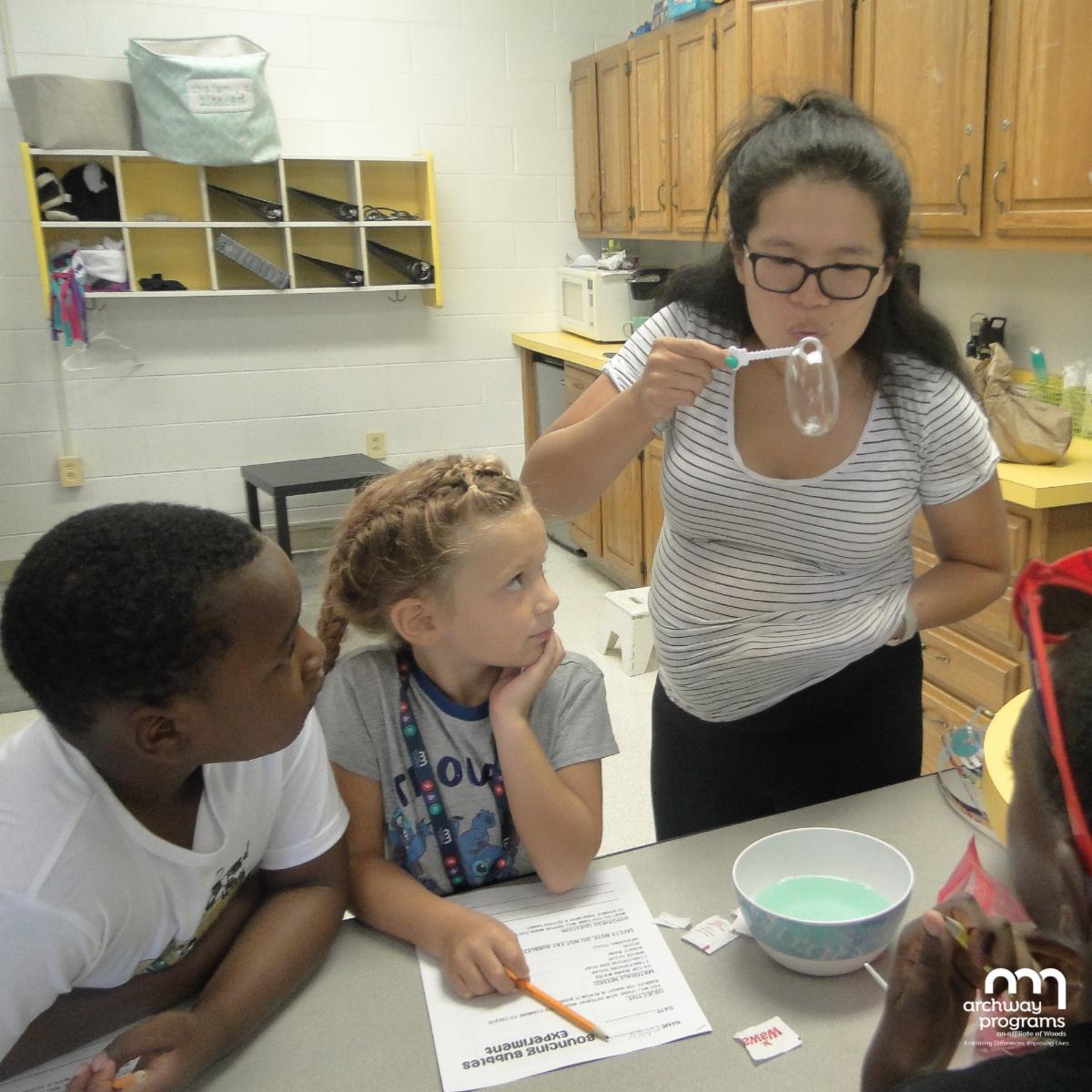 Ms. Kat and Ms. Christine's Creative Achievements Academy elementary classes did a bubble bouncing activity. Students were able to observe and test the bubble bouncing theory. The bubbles could be bounced up and down on the clothing of staff and students!