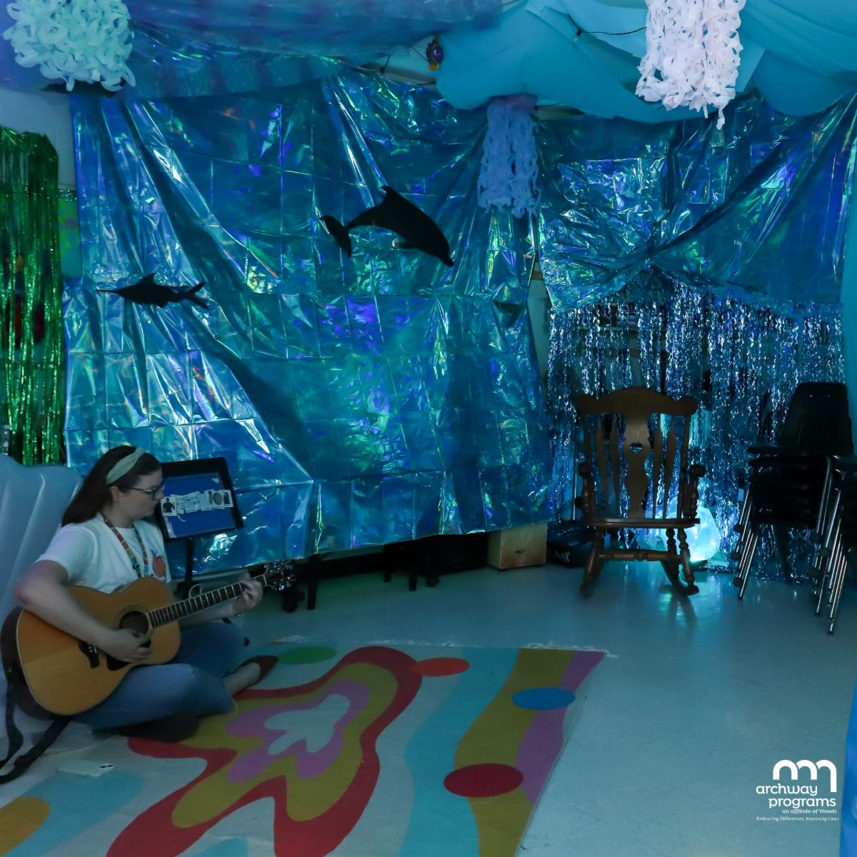 The creative talents of Miss Shayla, the Lower School Art Teacher, and Miss Katie, the Lower School Music Therapist, were showcased during Under the Sea Week. As you entered either classroom, the lights were dimmed, and you were greeted by the calming sounds of a bubbling fish tank alongside images of brightly colored fish swimming in tranquil waters. The walls and ceilings were adorned with decorations, creating a soothing, sensory-friendly underwater world filled with coral, shells, sea grass, and friendly sea creatures. Once you stepped inside, you didn't want to leave the tranquil environment created for their students.