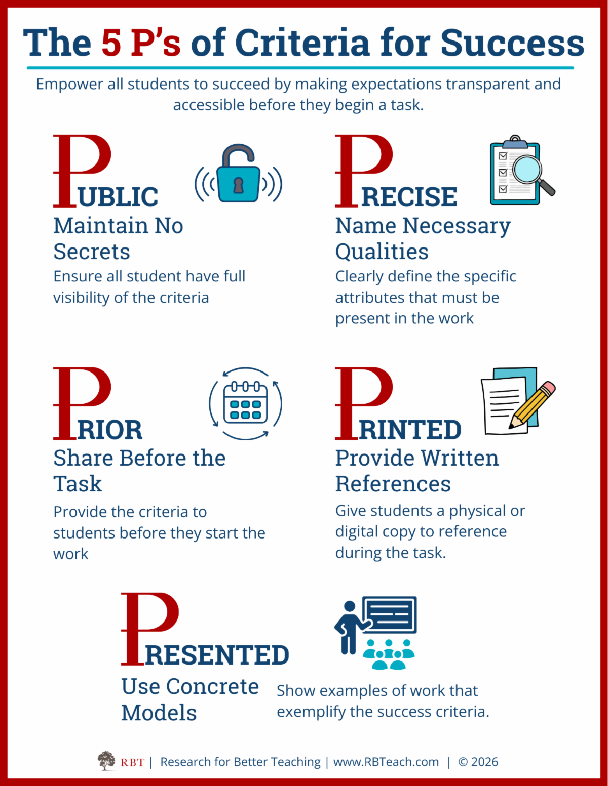 From making success criteria Public and Printed, to ensuring they are Precise, Presented with models, and shared Prior to task launch—this tool helps teachers empower students to meet rigorous standards with clarity and confidence