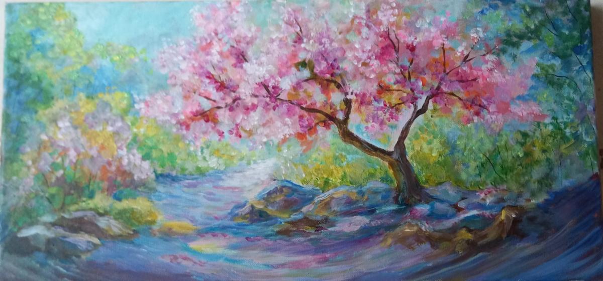 "YouTube tutorial 'Blossoming Blossoms' ...This was so pretty I had to paint it. I painted on a 10 x 20 canvas, only because I bought so many of this size! So the composition is a little different due to the size. I used Salvador paints."
