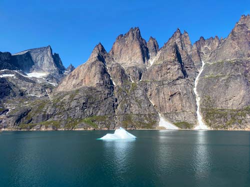 This photograph captures the breathtaking beauty of a fjord in Greenland. At the heart of the image, a colossal iceberg floats majestically, its icy surface gleaming under the sunlight. The iceberg, a product of thousands of years of compacted snow, is a testament to the frigid temperatures of the region. Behind it, a cascade of water tumbles down the steep cliffs, creating a waterfall that adds a dynamic element to the serene landscape. The mountains, towering in the background, are covered with snow and shrouded in mist, adding a sense of mystery and grandeur. The water surrounding the iceberg is calm, reflecting the cool hues of the sky above. This image is a vivid reminder of the raw, untouched beauty that exists in the remote corners of our world. | |