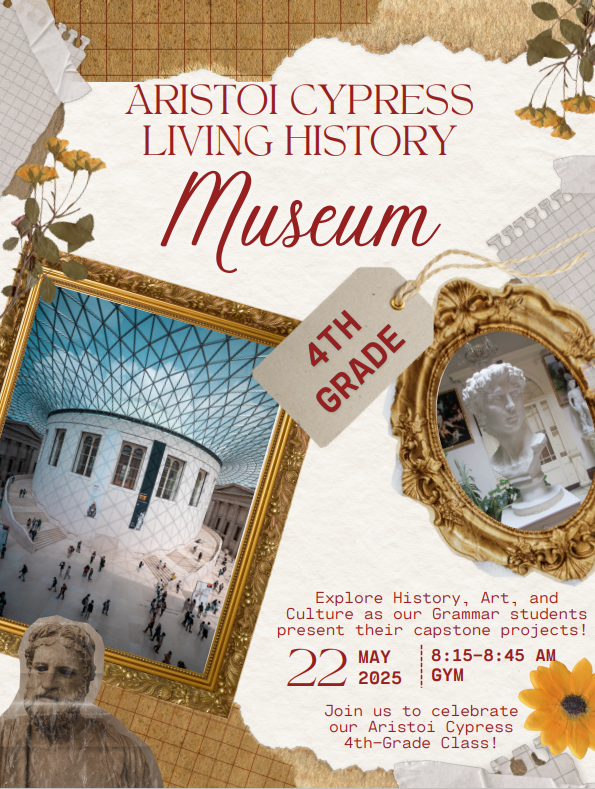 Join us for our 4th Grade Living History Museum in the Cypress Gym on May 22, 2025, from 8:15 AM to 8:45 AM! Students will showcase historical figures and events through engaging presentations and creative displays. This interactive experience allows visitors to step back in time and learn about history in a fun and memorable way. We look forward to seeing you there!