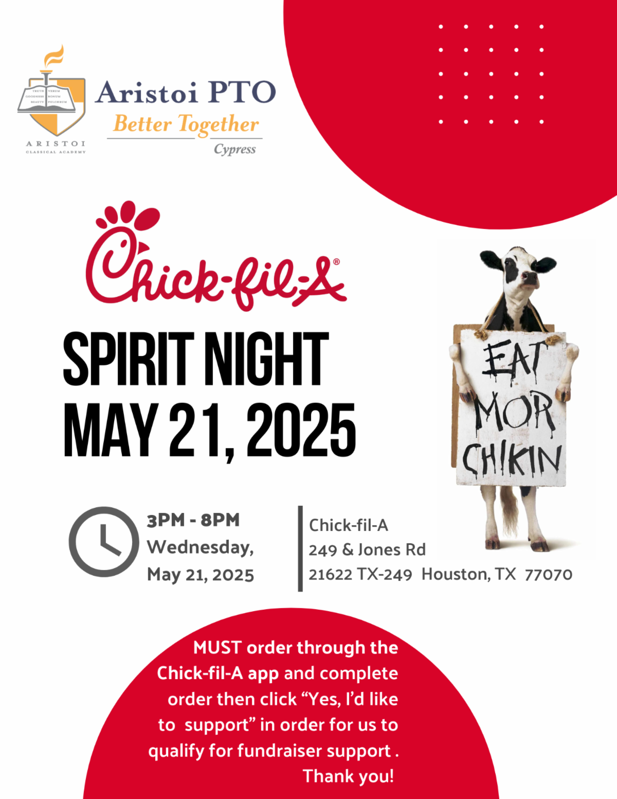 We invite you to join our Aristoi Cypress PTO for May Spirit Night at the Chick-fil-A at 249 and Jones Rd. from 3 PM to 8 PM. Come connect with our wonderful community and learn more about our amazing school!