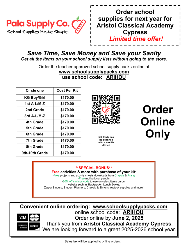 Get ready for the new school year with our exclusive back-to-school supply sale running through June 2nd! Stock up on all your essential supplies and ensure you're prepared for success. To place your order, simply fill out the order form above and use the link below. Don’t forget to enter the school code: ARIHOU at checkout.