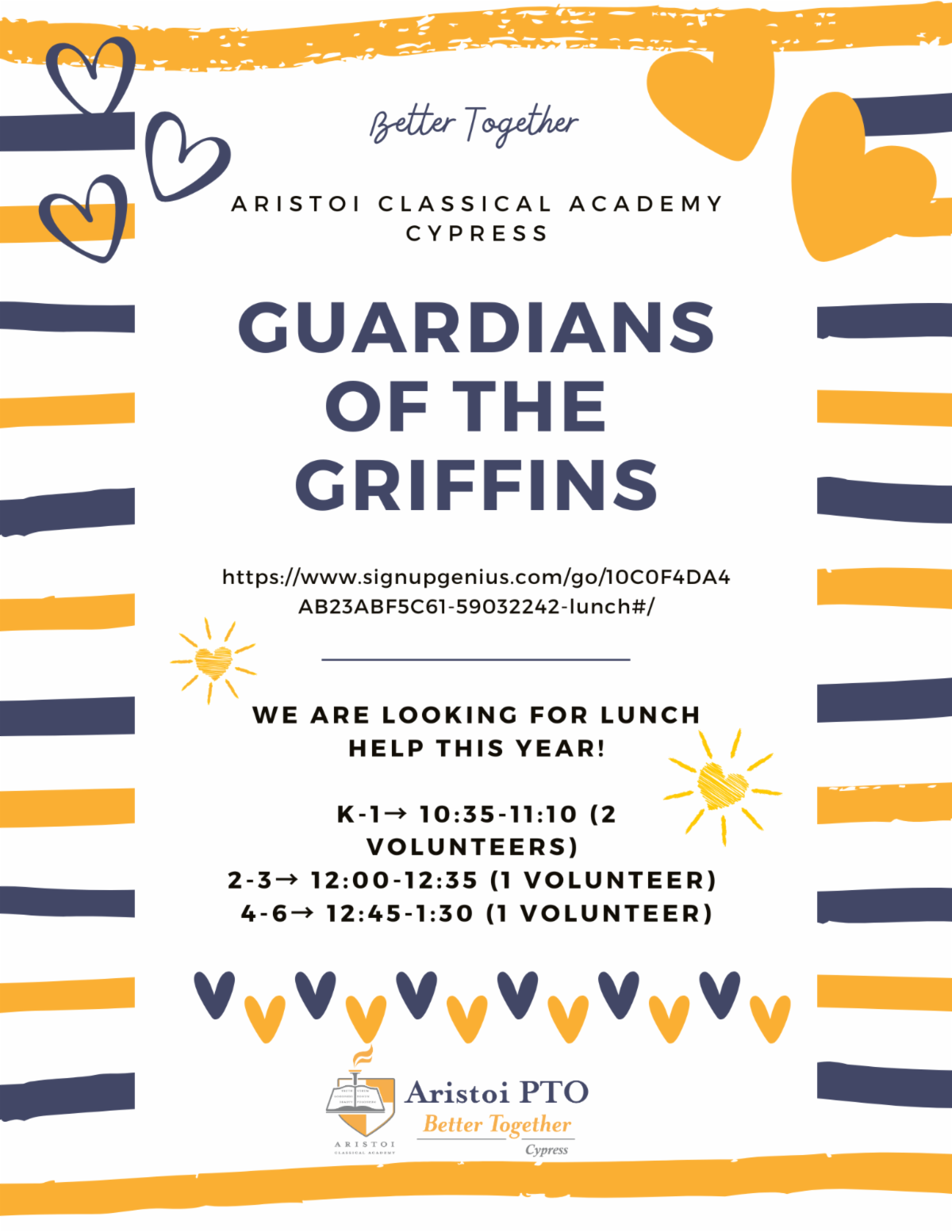 We’re currently looking for parents who would be willing to help support our staff during lunch. If you're interested and available, we’d love to have you sign up using the link below. Thank you so much for considering!