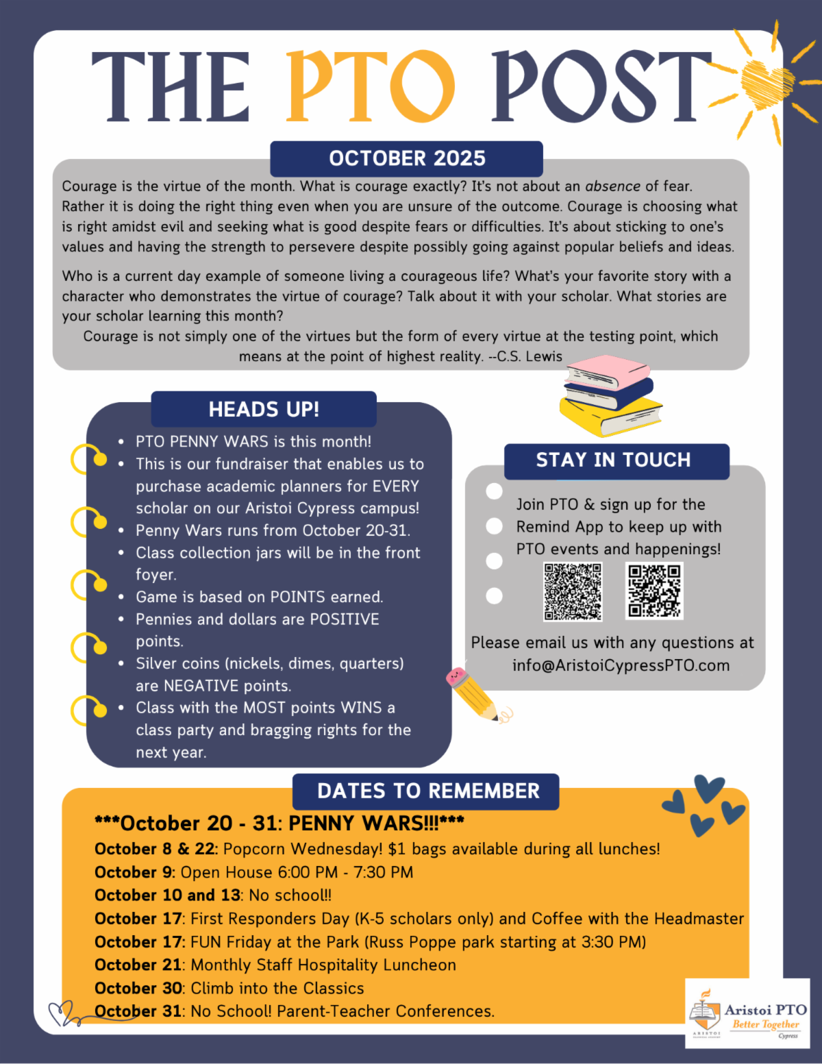 All funds raised by PTO will go towards purchasing academic planners for ALL Aristoi Cypress students for the next academic school year.