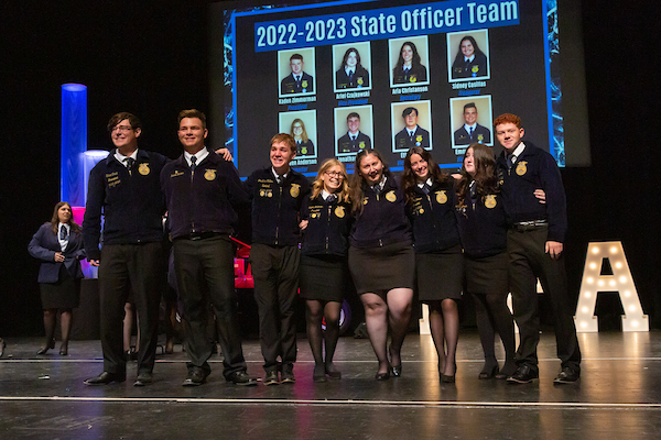 Each year during the State FFA Leadership Conference, FFA members are elected to serve on the State FFA Officer Team. This group of individuals go through a series of rigorous interviews and activities days prior to the conference with the nominating committee.